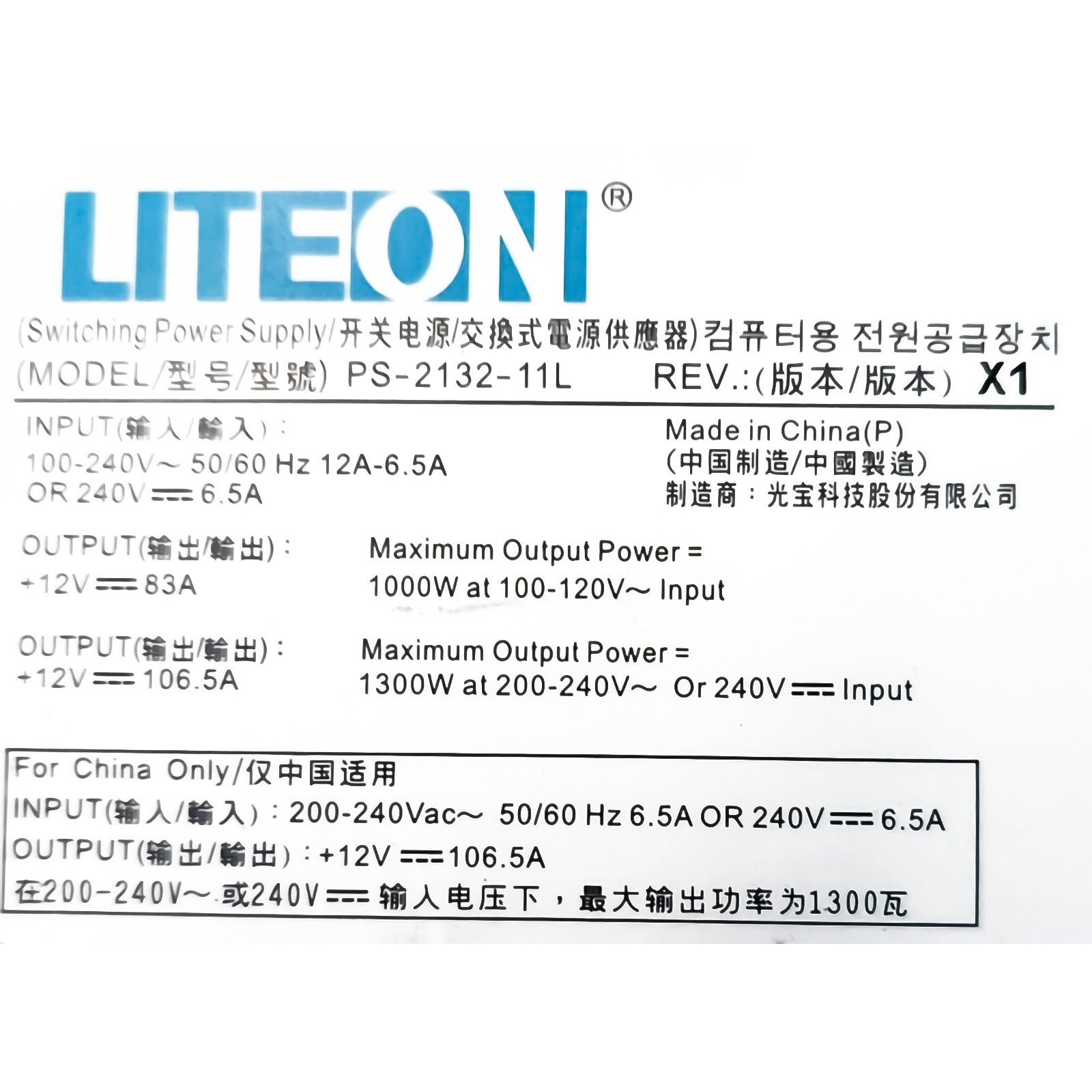 LiteON PS-2132-11L X1 1300 watt