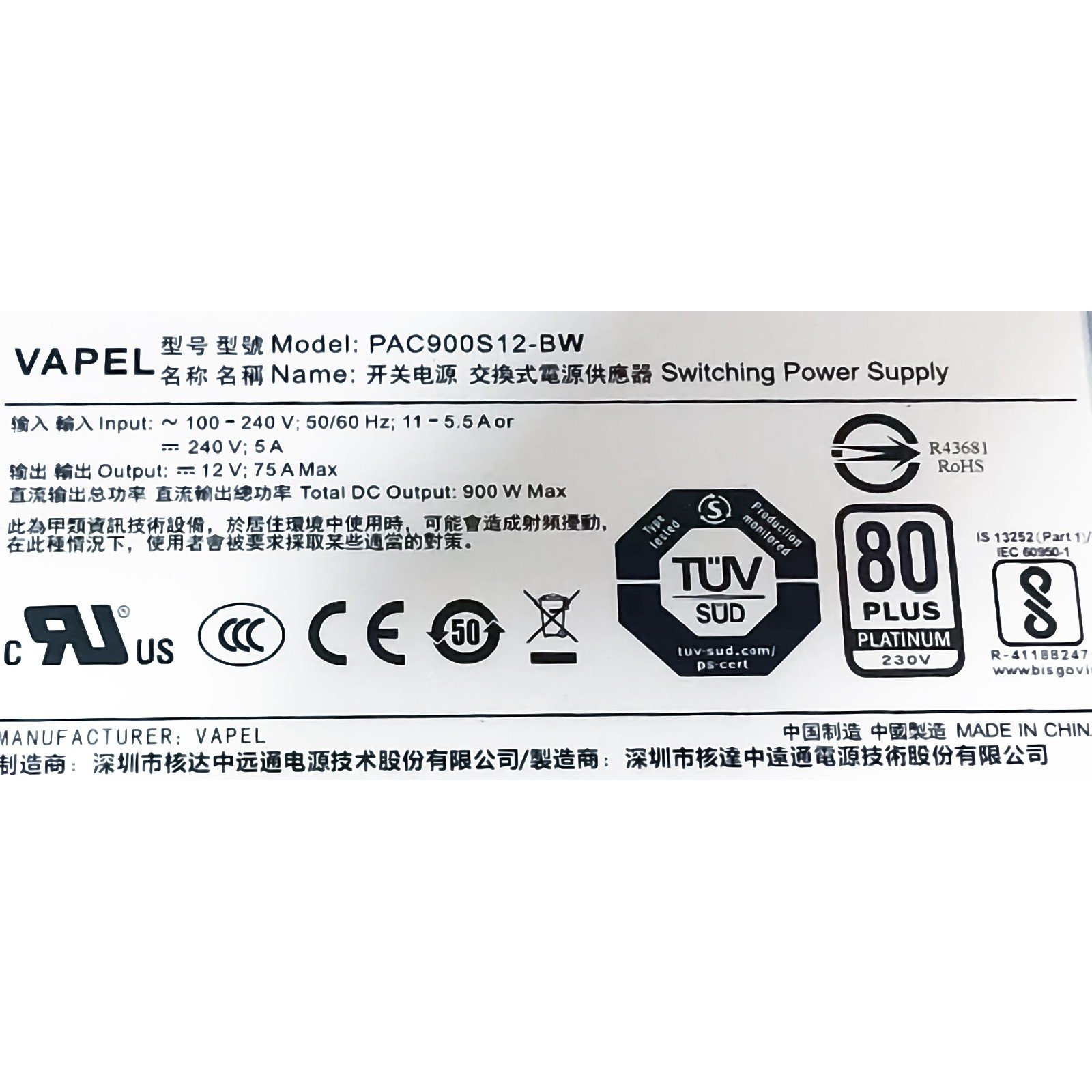 VAPEL PAC900S12-BW R43681, 900 w